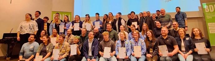 Mit ihrer Erntedankfeier mit Baumpflanzaktion hat sich die KiTa „die kolping kinder“ aus Kaufbeuren um den Schöpfungspreis 2024 des Bistums Augsburg in der Kategorie Kindertageseinrichtungen beworben. Bei der Preisverleihung am 17. Januar 2026 im Haus Sankt Ulrich in Augsburg überreichte Bischof Dr. Bertram Meier der Kolping-Delegation als Anerkennung für den Einsatz für die Bewahrung der Schöpfung die Laudato si-Plakette des Bistums Augsburg.