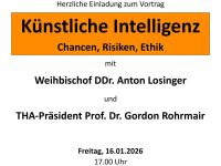 Weihbischof DDr. Anton Losinger, Bischofsvikar für Bioethik und Sozialpolitik, und Prof. Dr. Gordon Rohrmair, Präsident der Technischen Hochschule Augsburg, kommen am Freitag, 16. Januar 2026, 17.00 Uhr, zum Thema „Künstliche Intelligenz – Chancen, Risiken, Ethik“ ins Pfarrheim der Erlöserkirche in Augsburg-Göggingen (Wellenburger Str. 58, 86199 Augsburg). Die Kolpingsfamilie Göggingen lädt zu der Veranstaltung ein. mehr