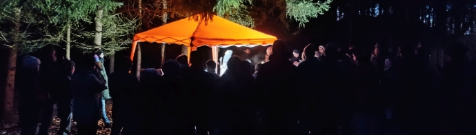 Das Vorbereitungsteam der Kolpingsfamilie Biberbach hatte für unterwegs verschiedene Stationen vorbereitet. So konnte gemeinsam mit David und dem alten Hirten Matthias die Geschehnisse damals in Betlehem zur Zeit der Volkszählung nachempfunden werden. Engelflügel mitten im Wald erinnerten, dass damals der Gottessohn zur Welt kam. Und dann mitten an einer Weggabelung fand sich dann auch das Christkind. Gemeinsam mit Ortspfarrer Ulrich Lindl war so das Weihnachtsgeschehen noch einmal auf ganz besondere Weise präsent. Gemeinsam gesungene altbekannte Lieder und der weihnachtliche Segen gehörten zur kleinen Andacht mitten im Wald dazu. Danach hatte die Kolpingfamilie noch einen wärmenden Punsch vorbereitet.