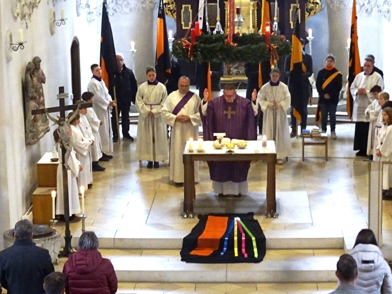 Mit den Kolping-Bannerträgern aus Gundelfingen, Lauingen und Wertingen und dem Diözesan- und dem Bezirksbanner wurde feierlich mit dem Altardienst ins Gotteshaus eingezogen.
