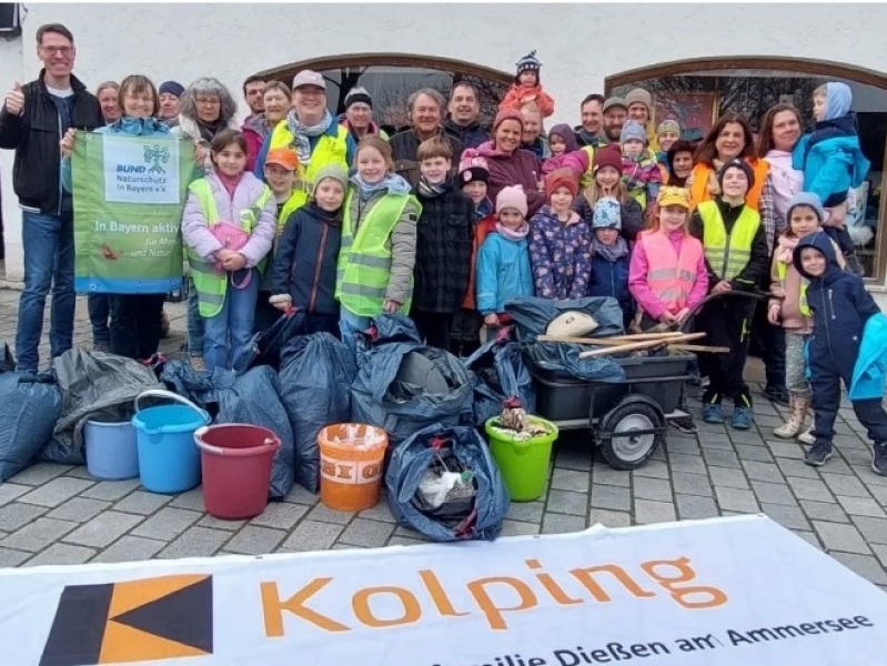 Traditionell im Frühjahr, wenn die Vegetation noch nicht so weit fortgeschritten ist, lädt die Kolpingsfamilie Dießen und die Ortsgruppe Dießen des BUND Naturschutz zu einem Landschaftsputz ein. Das Wetter spielte mit, und so folgten fast 30 Erwachsene und rund 15 Kinder dem Aufruf und säuberten mit großem Engagement Straßenränder, Parkplätze und Gebüsche.