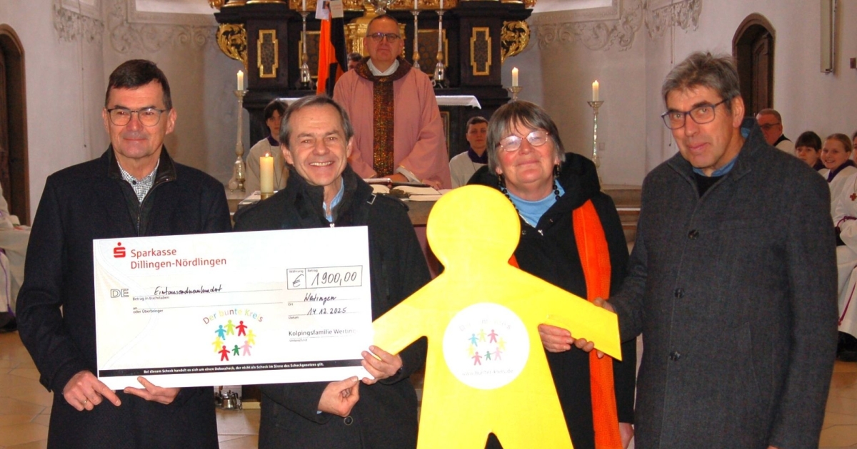 Die Spenden aus der Aktion werden für soziale Zwecke verwendet. Der Bunte Kreis erhielt zum 10. Mal eine Spende. Mit 1900 Euro aus der Nikolausaktion werden chronisch, krebs- und schwerstkranke Kinder in der Region Bayerisch-Schwaben unterstützt. Im Anschluss an die Messfeier zum Kolping-Gedenktag am 14. Dezember 2025 übergaben der Organisationsleiter Hans-Peter Steppe, die 1. Vorsitzende Angelika Munz und 2.Vorsitzende Johann Reiter an Diakon und Seelsorger Norbert Kugler vom Bunten Kreis den Erlös der Aktion.