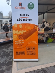 Die Vorbereitungen begannen lange im Voraus und Schulleiterin Judit Urbán berichtet bereits Ende Oktober über die Unterstützung, die von allen Seiten für die Aktion kam. In tagelanger Vorarbeit wurde die Roulade gebacken, Dekoration erstellt und die Füllung vorbereitet. 18.00 Uhr war es soweit und die Köstlichkeit wurden auf dem Markt in Esztergom dem Publikum präsentiert. Musik, Dankesworte und die Segnung durften nicht fehlen. Das Lokalfernsehen berichtet über die Aktion und sogar der Präsident des Ungarischen Rekordverbandes war angereist, um die Aktion zu begleiten und den Arbeitsprozess zu begutachten. Er stellte fest: der „Baumstamm“, wie ihn die Ungarn liebevoll nennen, war 184 Meter lang. Was für ein Erfolg für Schülerinnen und Schüler. Die Kuchenstücke wurden verteilt und gegen eine Spende abgegeben. Kolping Nationalvorsitzender Vajk Bánhidy resümiert: „Es war ein großartiges Ereignis, das die Stadt und die Kolpinggemeinschaft vor Ort und im ganzen Land bewegt hat!“