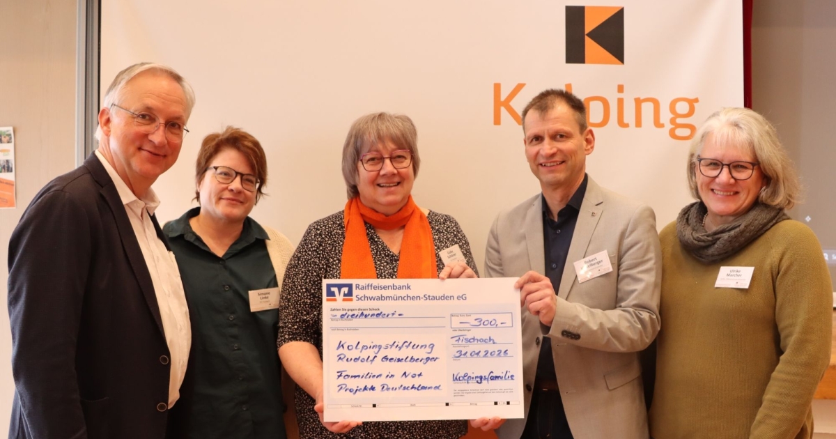 Am Rande der Kolping-Verantwortlichenkonferenz am 31. Januar 2026 in Augsburg übergaben Gaby Schöner, Vorsitzende der Kolpingsfamilie Fischach, und Simone Linke einen Scheck über 300 Euro an die Kolpingstiftung-Rudolf-Geiselberger für Familien in Deutschland. Kolping-Diözesanpräses Wolfgang Kretschmer, Kolping-Diözesanvorsitzender Robert Hitzelberger und die stellv. Kolping-Diözesanvorsitzende Ulrike Marcher freuen sich über die Unterstützung.