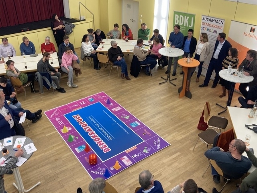 Zur Bundestagswahl entwickelten katholische Verbände im Bistum das „Demokratopoly-Spiel“ (angelehnt an Monopoly), bei dem Kandidierende zu unterschiedlichen Themen spielerisch ins Gespräch kommen. Die Gäste können sich so ein Meinungsbild über Personen und Inhalte bilden. Die Variante für die Kommunal– und Landkreiswahl also z.B. Landrat– oder Stadtratswahl ist ab Winter 2025 verfügbar und ausleihbar. Das Tolle daran: je mehr Verbände sich vor Ort zusammenschließen, umso mehr Aufmerksamkeit bekommt ihr. Außerdem sind verschiedene Themen bereits vorbereitet und ihr könnt, eigene Themen mit einbringen und auswählen.