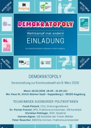 Mit Demokratopoly, angelehnt an das Spiel Monopoly kommen die Kandidierenden in Bewegung. Durch Würfeln gilt es auf dem Feld eine Frage, welche der entsprechende Verband aus seinem Profil heraus entwickelt hat, zu beantworten. Das Publikum erhält ebenfalls die Möglichkeit, sich mit Fragen an dem Spiel zu beteiligen. Auch die ein oder andere Fitnessübung wird zum Zuge kommen.